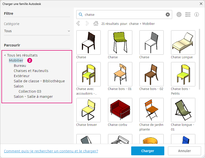 N’oubliez pas que l’outil de recherche fonctionne sur les éléments actuellement affichés dans l’arborescence. Combinez la recherche et le filtrage pour trouver une famille spécifique. Par exemple, une recherche sans filtre est effectuée sur le terme « chaise » et plusieurs familles de chaises sont répertoriées. Nous obtenons également un élément de détail, un profil Antibois. Si nous sélectionnons le groupe d’éléments de détail en tant que filtre sous Parcourir avant d’effectuer la recherche, seul l’élément de détail Antibois s’affiche dans le résultat de la recherche