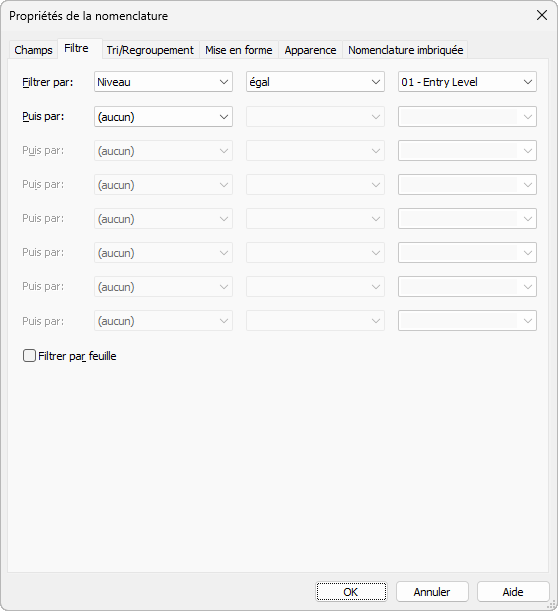 Le paramètre Niveau doit être inclus dans la nomenclature pour que le filtre fonctionne, mais il n’a pas besoin d’être affiché. Cliquez sur Masquer