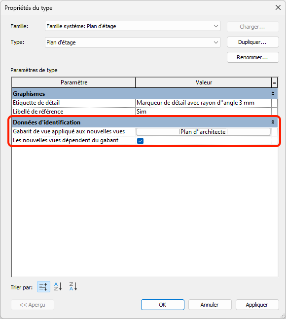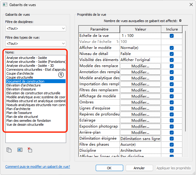 Appliquer les propriétés de gabarit à la vue en cours : sélectionnez un gabarit et appliquez les paramètres de visibilité correspondants à la vue en cours.