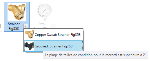 Lorsque vous cliquez sur la flèche, une liste déroulante affiche d'autres éléments en fonction de la taille. Cette liste déroulante est contrôlée par les conditions de la définition du service et est semblable aux préférences d'acheminement. Par exemple, un cintrage peut utiliser un cintrage vers le haut jusqu'à une taille donnée et un cintrage segmenté au-delà de cette taille. Lorsque vous placez le curseur sur un élément dans la liste, une info-bulle affiche l'intervalle de tailles en fonction de la condition de l'élément.