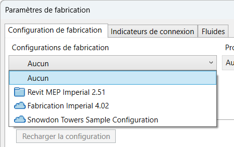 Utilisez la boîte de dialogue Paramètres de fabrication pour spécifier une configuration et un profil de fabrication, et charger les services de fabrication dans le modèle.