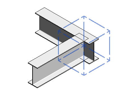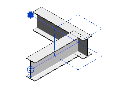 La coupe est créée au niveau de l'âme de l'élément sécant. La sous-connexion est représentée par un cube en pointillés. Vous pouvez cliquer sur le symbole du losange situé sous l'étiquette numérotée pour modifier la coupe de l'élément à l'aide de l'outil Coupe à l'âme.