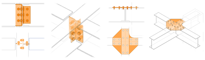 Un assemblage personnalisé peut inclure des éléments en acier tels que des plaques, des profils, des boulons ou des soudures, ainsi que des assemblages standard (sauf pour les assemblages de raidisseurs), des coupes paramétriques ou des familles et formes d'ossature et de poteaux en acier de construction prises en charge. Vous pouvez combiner tout élément en acier, toute connexion standard et toute coupe paramétrique pour définir votre connexion personnalisée.