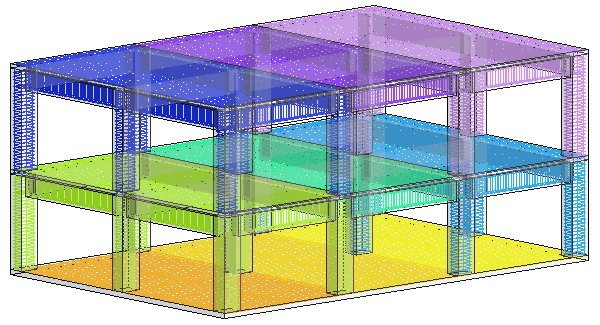 L'image suivante est une représentation visuelle de 9 ensembles dans un modèle de base pour lequel chaque niveau possède 3 ensembles spécifiques. L'armature affectée à un ensemble spécifique s'affiche en couleurs. L'armature peut être divisée et regroupée en fonction des besoins (moment et emplacement).
