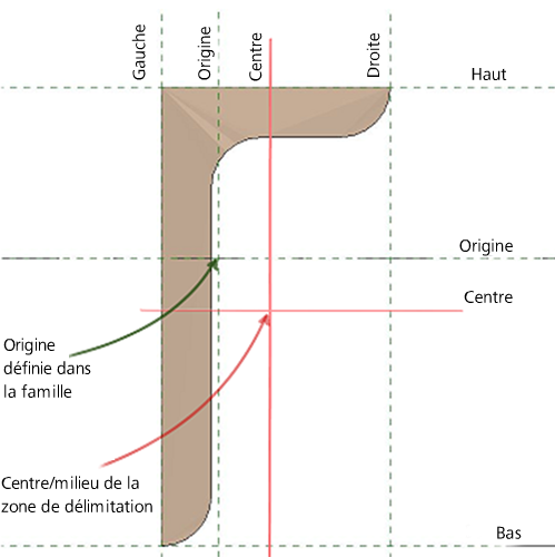 Dans certains cas, l'origine de la famille d'un élément d'ossature ne s'aligne pas par rapport au centre de la zone de délimitation de l'élément.