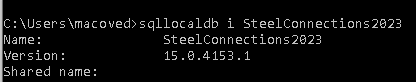 2. Ouvrez l’invite de commandes, puis exécutez « sqllocaldb i SteelConnections20xx » pour vérifier que l’instance SqlLocalDB a été créée avec la version définie dans le fichier ASSettings_Advance.xml. La version répertoriée doit être 15.0…. pour SqlLocalDB 2019.