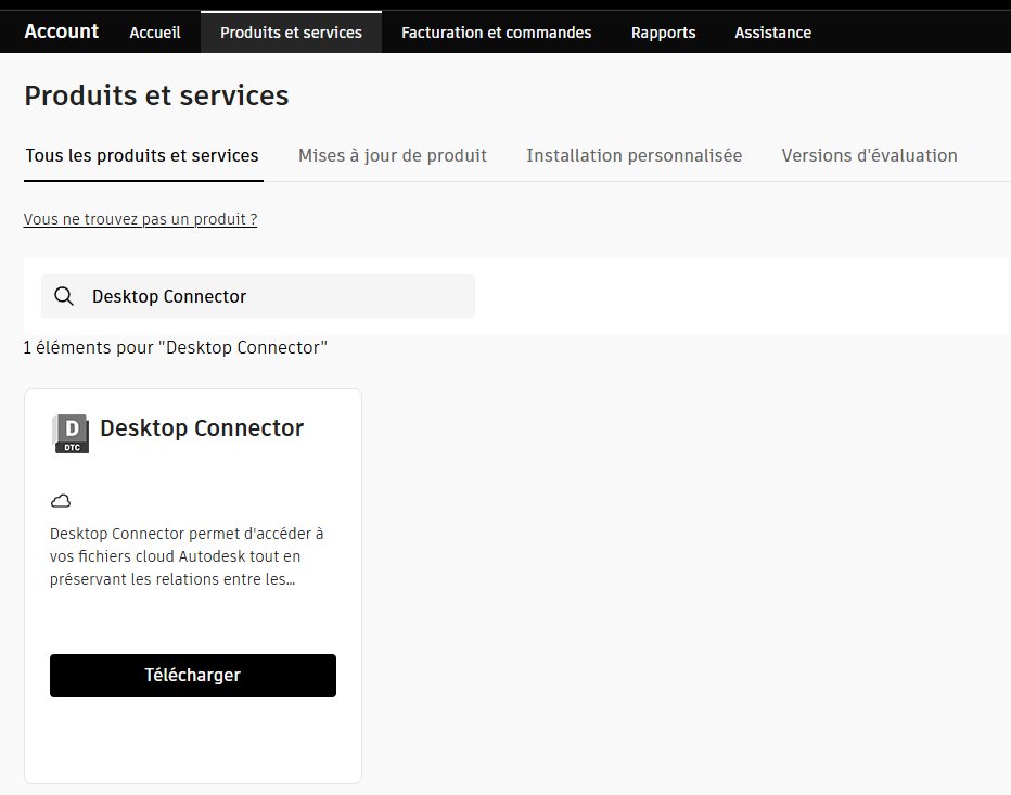 Pour télécharger la version la plus récente, accédez à la page Produits et services de votre compte Autodesk. Desktop Connector s’affiche sous Produits et services.