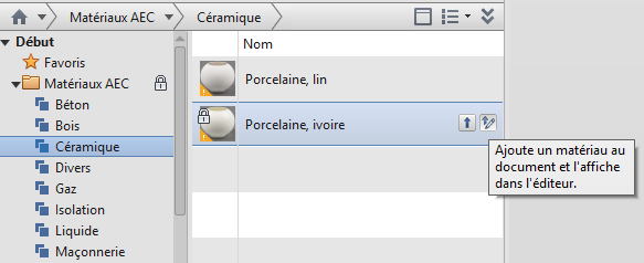 . Ce bouton ajoute un matériau de la bibliothèque à la liste des matériaux du projet.
