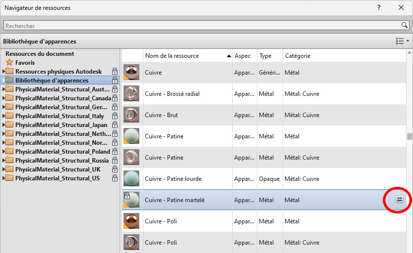 Remplacez une ressource par une autre ressource que vous sélectionnez dans le navigateur de ressources. Le matériau adopte les propriétés de la nouvelle ressource.