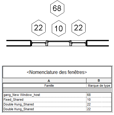 Pour étiqueter et inclure à la fois la fenêtre fixe et les fenêtres à guillotine dans la nomenclature, la même famille de trois fenêtres a été créée. Mais cette fois, une nouvelle famille de fenêtres est utilisée en tant que famille hôte ; la fenêtre fixe et les fenêtres à guillotine sont chargées en tant que familles partagées. Remarquez les différences d'étiquetage et de nomenclature.