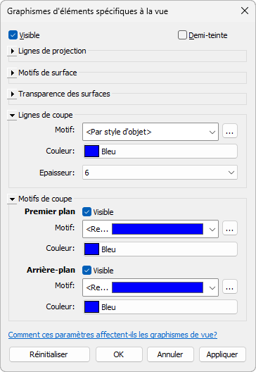 Remplacements de visibilité/graphismeRemplacer les calques hôteStyles de lignes de coupe
