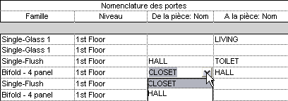 La nomenclature de portes s'ouvre. Les champs A la pièce et De la pièce ne sont pas automatiquement mis à jour lorsque vous modifiez la pièce, mais vous pouvez modifier ces champs en sélectionnant une valeur dans la liste.