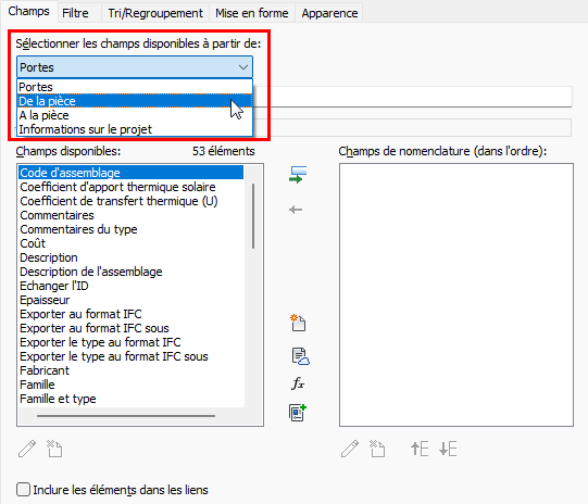 - Dans l'onglet Champs, sous la liste déroulante Sélectionner les champs disponibles à partir de, sélectionnez De la pièce ou A la pièce.
