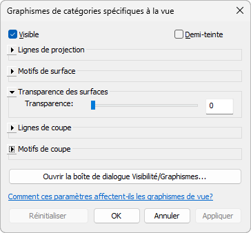 La boîte de dialogue Graphismes de catégories spécifiques à la vue affiche les paramètres actuels de visibilité et d'affichage des graphismes pour la catégorie sélectionnée. Développez chaque section pour afficher ses paramètres.