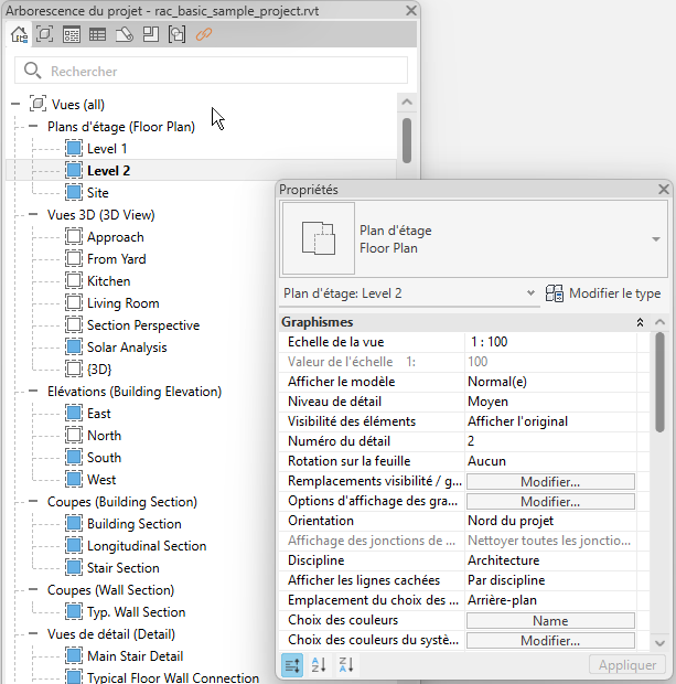 Il est possible de déplacer et de redimensionner les fenêtres ancrables. Ces dernières peuvent être flottantes ou ancrées à un emplacement spécifique dans la fenêtre de l'application Revit LT ; vous pouvez également les faire glisser hors de la fenêtre de l'application Revit LT dans leur propre fenêtre et les déplacer sur un autre écran.