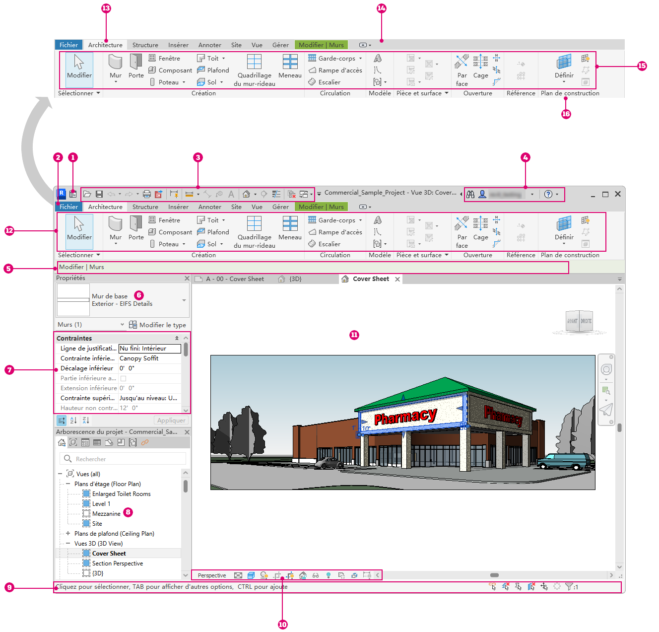 | 14 | Onglet contextuel du ruban fournissant des outils relatifs à l'objet sélectionné ou à l'action en cours |