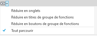 | Spécifier la méthode préférée pour réduire le ruban | A droite des onglets du ruban, cliquez sur la flèche de droite et sélectionnez le comportement souhaité : Réduire en onglets, Réduire en titres de groupe de fonctions, Réduire en boutons de groupe de fonctions ou Tout parcourir.