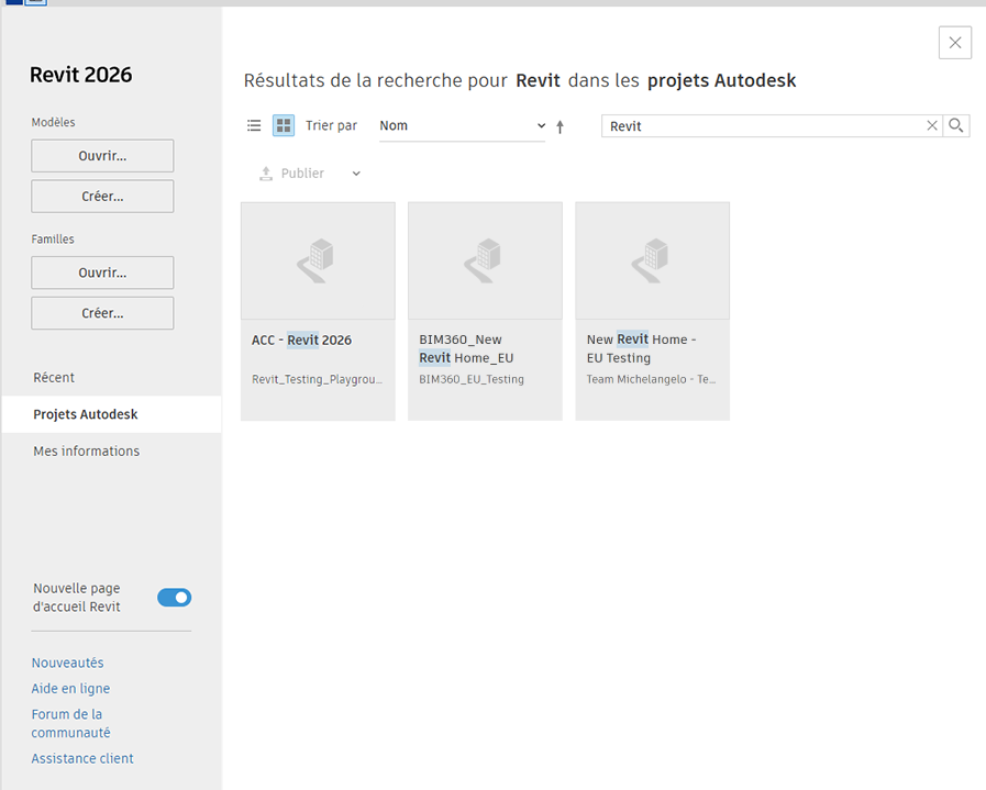Utilisez le bouton d’option Nouvelle page d’accueil de Revit pour passer de la page d’accueil classique à la nouvelle page d’accueil.