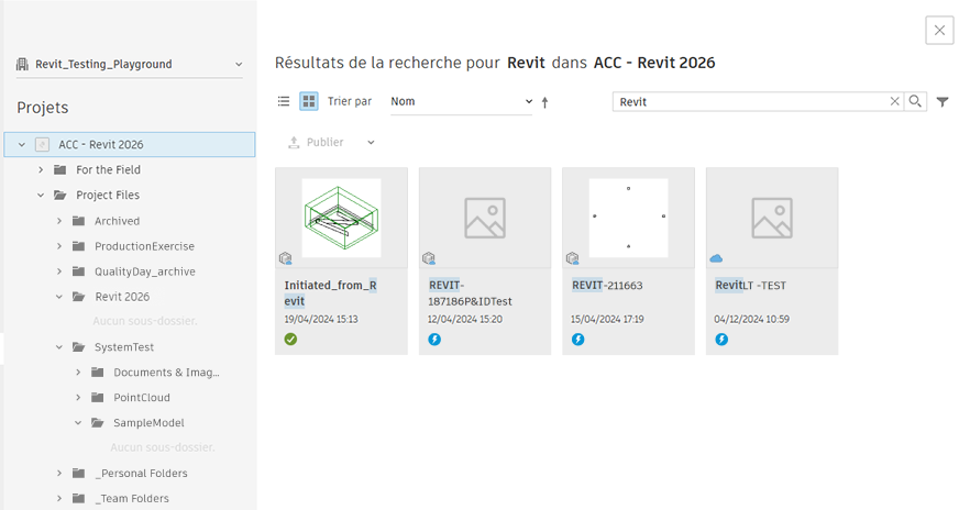 - Vues de grille et de liste disponibles. La vue de grille dans la page Projets Autodesk affiche des miniatures des modèles cloud, une icône pour chaque type de modèle (partagé ou non) et l’état de publication avec des icônes.