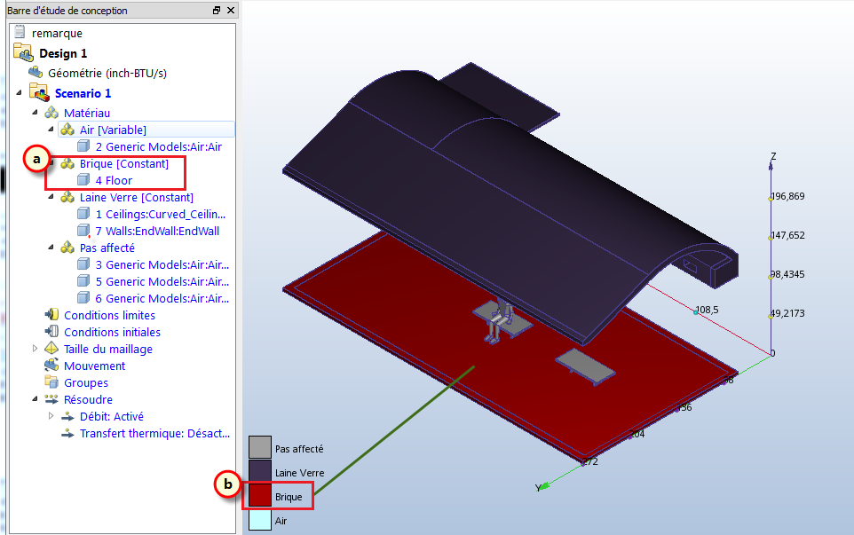 7. Pour vérifier que le matériau Brique est affecté correctement, vérifiez la barre Étude de conception et la couleur de la pièce :
