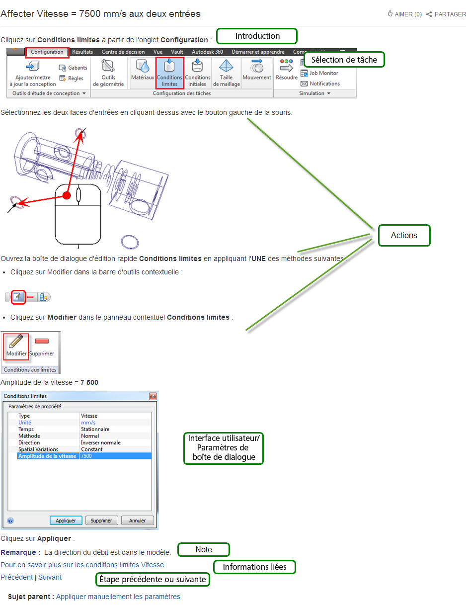 Lorsque vous utilisez des exemples, il est pratique de positionner les fenêtres du navigateur et d'Autodesk® CFD l'une à côté de l'autre. Les étapes utilisent normalement une présentation étroite compatible avec une largeur de navigateur réduite.