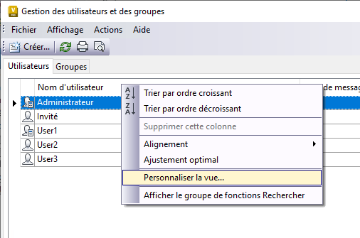 Dans la boîte de dialogue Gestion des utilisateurs et des groupes, sélectionnez l’onglet Utilisateurs. Vous pouvez répertorier les comptes utilisateur de trois manières différentes :
