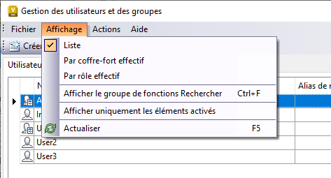 Affichez les profils utilisateur sous forme de liste simple, de liste classée par coffres-forts effectifs auxquels les utilisateurs peuvent accéder, ou de liste classée par rôle effectif.