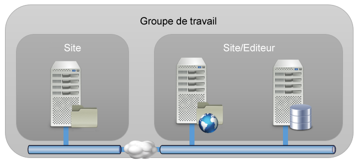 Vous pouvez répliquer les magasins de fichiers d'un site sur un autre. Ce processus est géré par une base de données Microsoft SQL. La configuration de réplication est appelée groupe de travail.