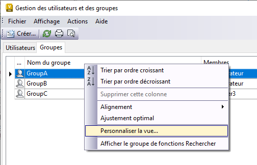 Dans la boîte de dialogue Gestion des utilisateurs et des groupes, sélectionnez l’onglet Groupes. Vous pouvez répertorier les groupes de trois manières différentes :
