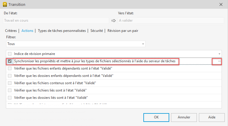 Dans la liste des actions disponibles, cochez la case Synchroniser les propriétés et mettre à jour les types de fichiers sélectionnés à l’aide du serveur de tâches.