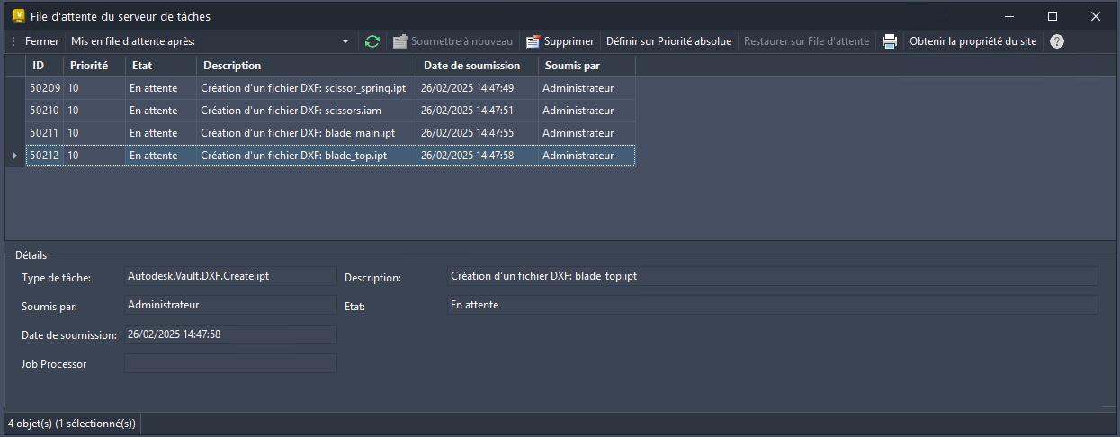 La file d’attente du serveur de tâches est une liste, ou file d’attente, des tâches envoyées par les clients (Inventor, Auto, Vault et Autoloader) et qui sont en attente de traitement. La file d’attente est stockée et gérée par le serveur Vault.