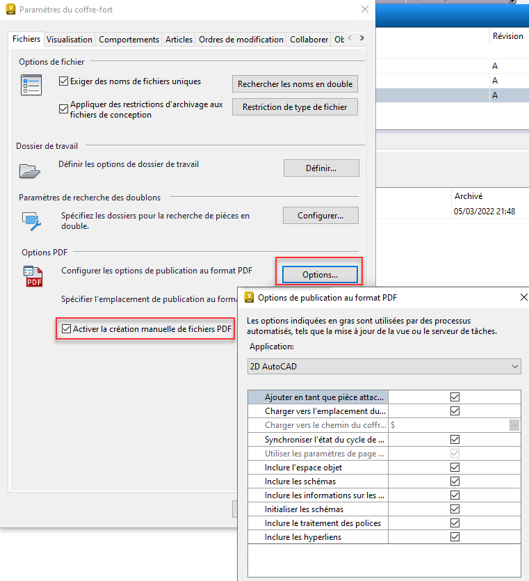 Cochez la case Activer la création manuelle de fichiers PDF pour pouvoir créer un PDF sans passer par la modification de l’état du cycle de vie d’un fichier 2D. La commande Créer un fichier PDF est disponible dans la barre d’outils, le menu contextuel et le menu Actions.