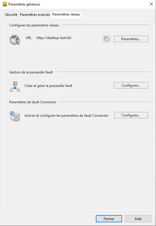 L’onglet Paramètres réseau affiche l’URL du serveur utilisée pour la connexion à l’application Vault Client.