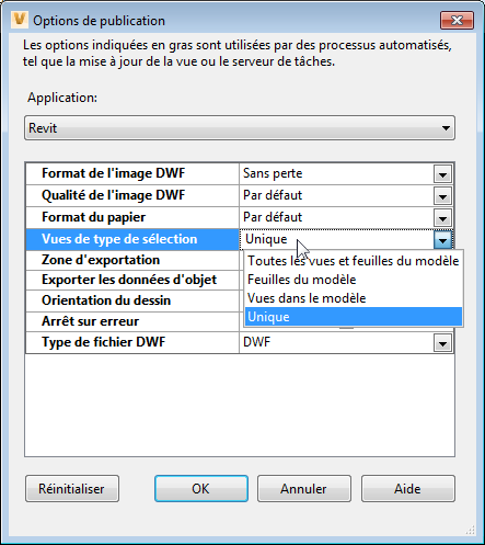 Inclure les vues de conception | Inclut toutes les vues de conception dans le fichier DWF. |