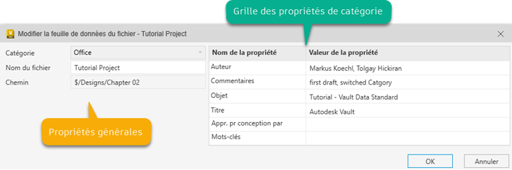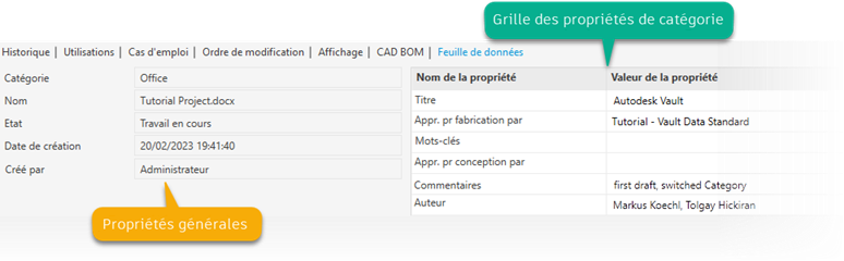 La grille des propriétés générales comporte des définitions statiques, une étiquette et un contrôle de contenu lié à une propriété Vault, enregistré dans le fichier de définition de la boîte de dialogue. La grille dynamique est un objet grille vide qui ajoute automatiquement des étiquettes et des champs de valeur par la sélection d’une catégorie d’entité (Fichier, Dossier, Objet personnalisé). Ces deux grilles sont les éléments principaux dans les onglets Créer/Modifier des feuilles de données (voir l’image ci-dessus) et les feuilles de données dans les onglets de détail :