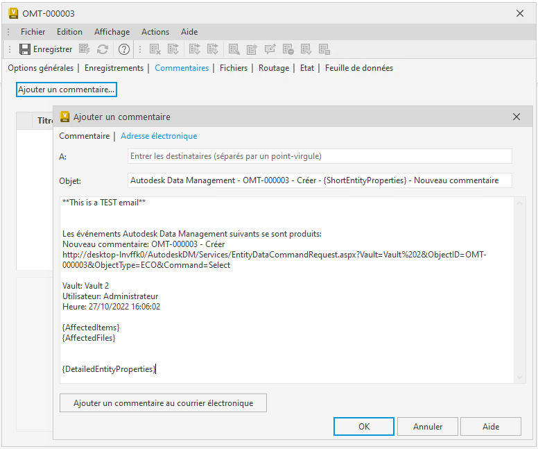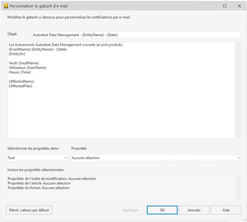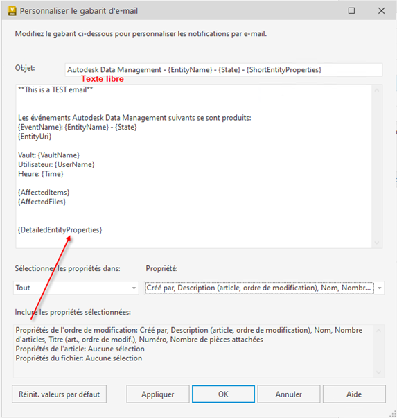 Un nouvel attribut de propriété {DetailedEntityProperties} est ajouté au corps de l’e-mail sous les {AffectedItems} et {AffectedFiles}. Vous pouvez copier et coller {DetailedEntityProperties} pour le réorganiser dans une autre section du corps de l’e-mail.