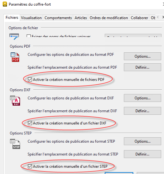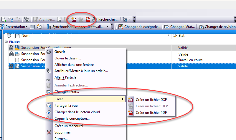 Important : les commandes Créer un fichier DXF, Créer un fichier PDF et Créer un fichier STEP sont uniquement disponibles pour la version la plus récente du fichier et non pour n’importe quelle version/révision historique des fichiers CAO.