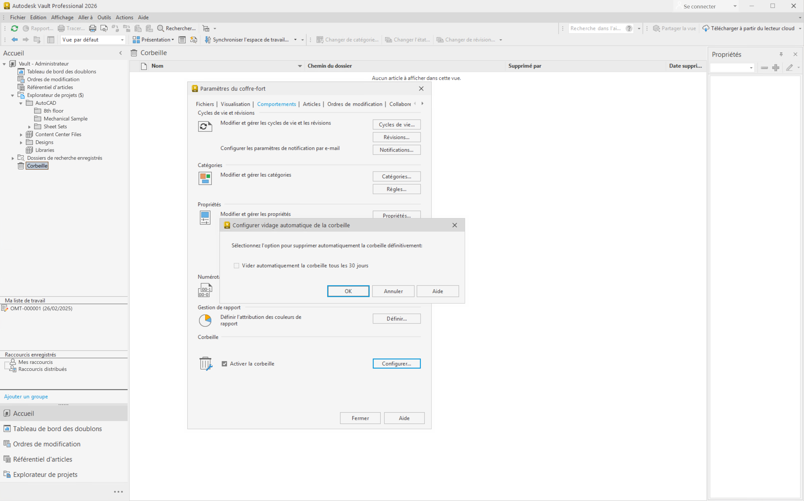 En tant qu’administrateur, vous pouvez choisir de supprimer automatiquement les objets de la corbeille 30 jours après la suppression ou de vider manuellement la corbeille à tout moment. Vous pouvez effectuer les actions suivantes dans le workflow lié à la Corbeille :