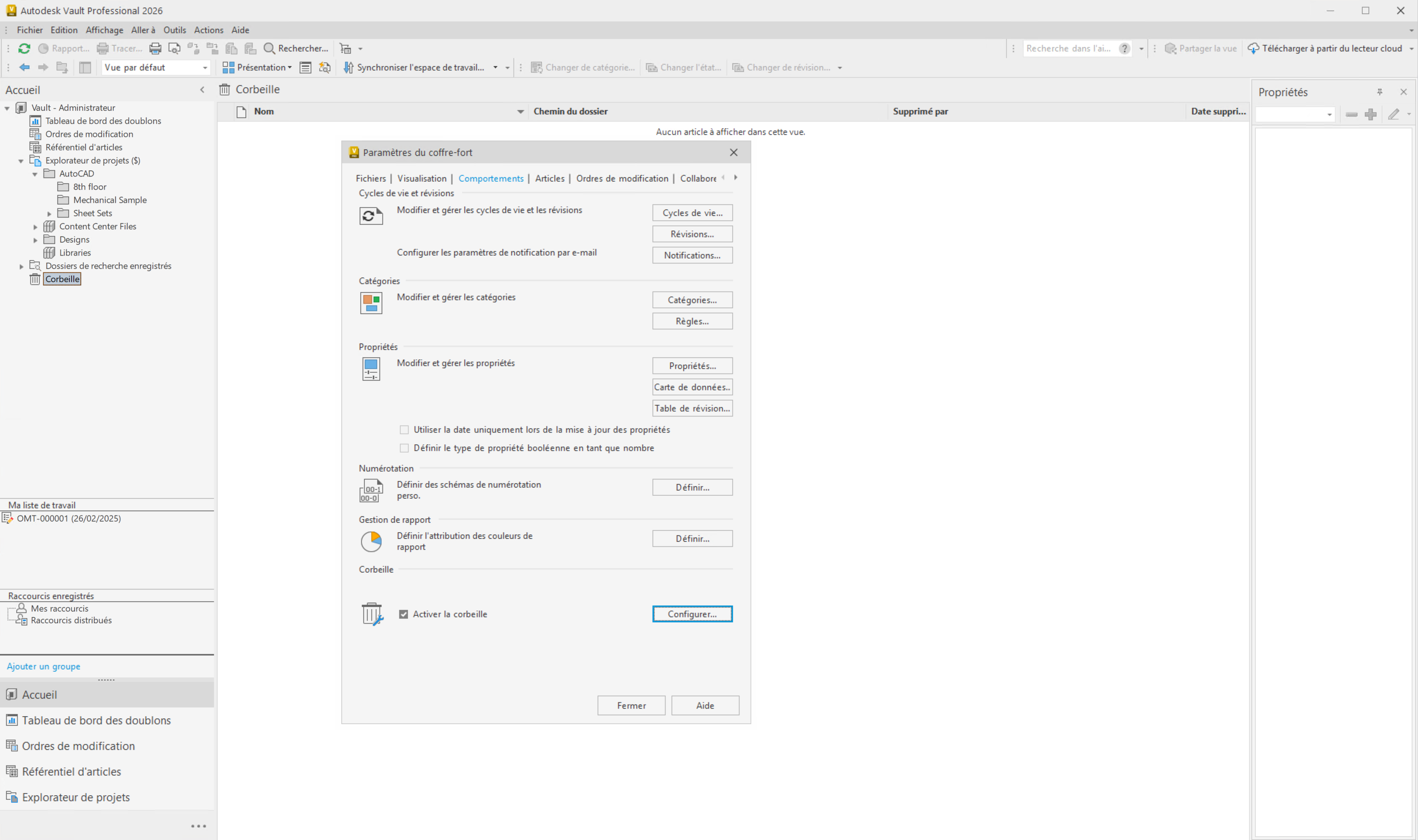 En tant qu’administrateur, vous pouvez activer ou désactiver la fonctionnalité Corbeille dans l’onglet Paramètres du coffre-fort > Comportement. Une fois que vous avez désactivé la fonctionnalité Corbeille, le workflow de suppression recommence à supprimer définitivement les fichiers ou dossiers.