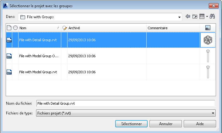 Sélectionnez un fichier .rvt, puis cliquez sur Sélectionner pour afficher les groupes disponibles.
