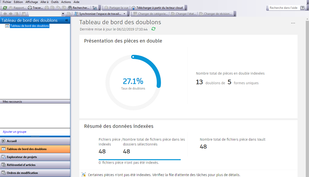 Une fois les fichiers indexés, vous pouvez afficher les données dans le Tableau de bord des doublons. Dans Vault Client, cliquez sur Tableau de bord des doublons. Vous pouvez afficher le rapport sur les pièces en double, qui peut également être exporté au format Excel, PDF ou Word.