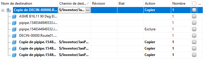 La vue principale de Copy Design affiche le nom des objets pouvant être copiés, le dossier de destination, l’action qui sera effectuée sur le fichier, la révision et l’état du fichier, ainsi que le nombre d’occurrences du fichier dans la liste actuelle. Que vous dupliquiez un dessin, une structure de conception complète ou des composants individuels, vous pouvez modifier les propriétés clés au cours du processus de copie à l’aide de la fonctionnalité intuitive de copier/coller ou en important directement à partir d’Excel.
