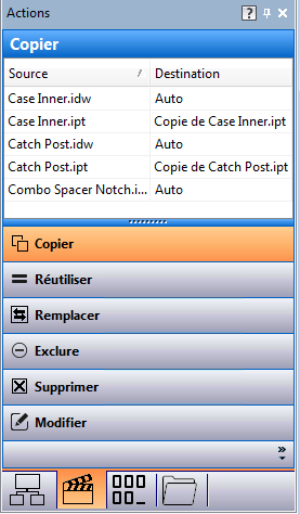 Actions | Le groupe de fonctions Actions vous permet de passer en revue les opérations attribuées en vue d’être effectuées au niveau des fichiers dans la vue principale. Une fois que vous avez configuré les fichiers dans la vue principale, vous pouvez utiliser le groupe de fonctions Actions pour filtrer les fichiers en fonction de l’opération qui leur est attribuée. Les opérations affectées sont notamment les suivantes : copie, réutilisation, remplacement, exclusion, suppression ou modification. Remarque : vous pouvez également définir les opérations d’action en faisant glisser les fichiers depuis la grille principale vers le bouton de l’opération de votre choix dans le groupe de fonctions Actions. Pour plus d’informations, reportez-vous à la rubrique Groupe de fonctions Actions. |