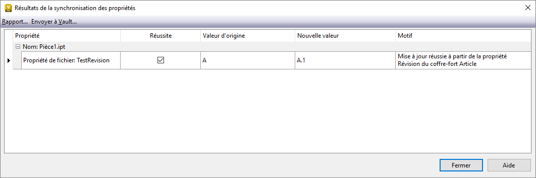 Sélectionnez le fichier et cliquez sur Actions > Synchroniser les propriétés. Vous constaterez qu’aucune modification n’a été apportée à la propriété du fichier Part1.ipt. Le fichier Part1.ipt reste à la révision A, même si vous synchronisez les propriétés.