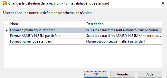 Dans la boîte de dialogue Changer la définition du schéma de révision, sélectionnez le nouveau schéma de révision que vous souhaitez attribuer à l'article sélectionné. Cliquez sur OK.