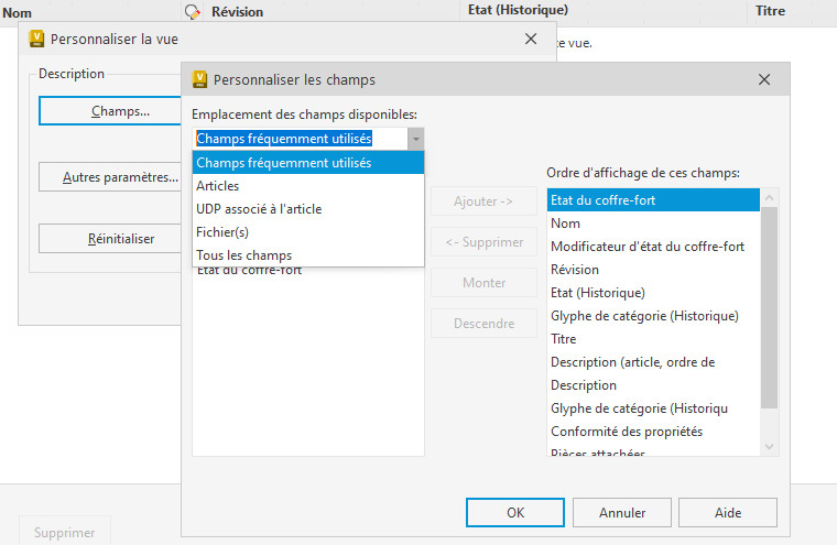 Les propriétés (colonnes) sont basées sur le type d’objet. Dans certains cas, les propriétés sont marquées (Article, Ordre de modification) pour indiquer qu’elles sont propres aux articles et aux ordres de modification.