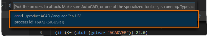 5. If you choose AutoLISP Debug: Attach from the Configurations list, choose acad (or AutoCAD on Mac OS) from the list of running processes.