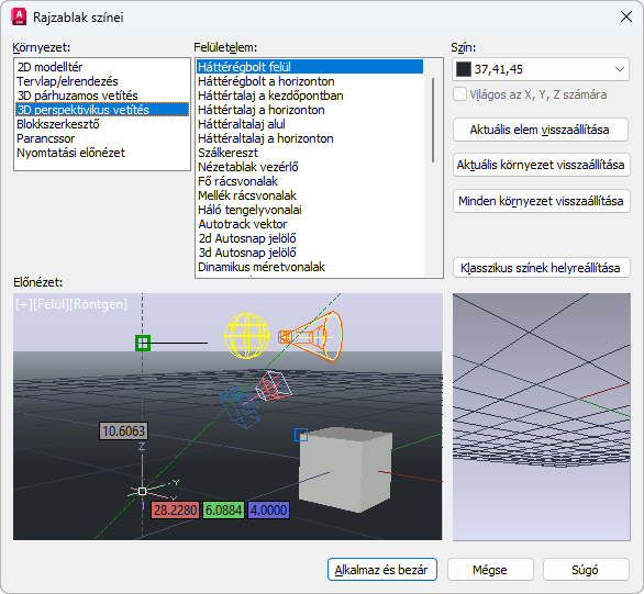 Megadja, hogy az X, Y és Z tengelyen színvilágosítás alkalmazva lesz-e az alábbi interfész elemekre: szálkereszt mutató, Autotrack vektorok, alapsík rácsvonalak és skiccelési eszköztárak.