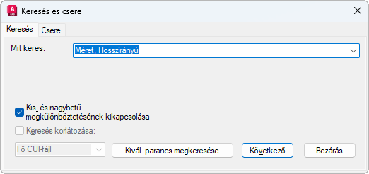 Megkeres minden parancsot vagy parancstulajdonságot írásmódjuktól függetlenül (például a parancs a VONAL és vonal parancsot is megtalálja).
