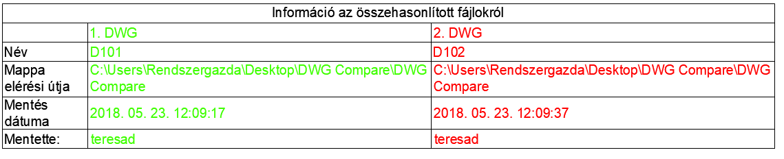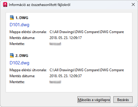 Ez a parancs egy párbeszédpanelt jeleníti meg, amely két összehasonlított rajzfájllal kapcsolatos információkat tartalmaz. A beállításokkal táblázatobjektumot hozhat létre ezekből az információkból, vagy a Vágólapra másolhatja azokat.
